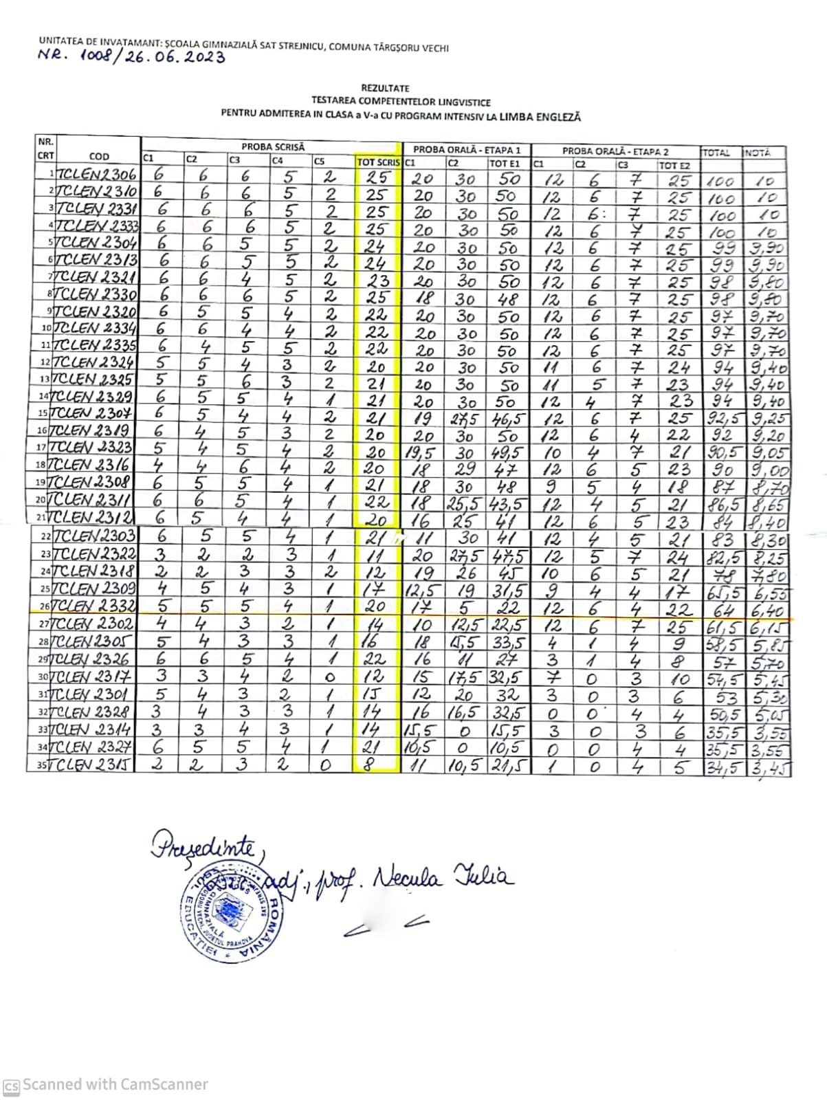 Rezultate finale admitere în clasa a V-a cu program intensiv la limba engleză iunie 2023